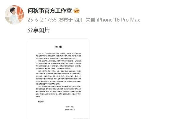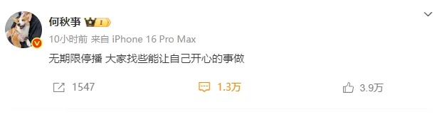 何秋亊在社交媒体上写道:“无期限停播,大家找些能让自己开心的事做。”