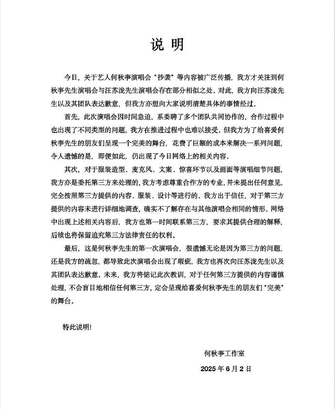 6月2日,因演唱会造型引发#何秋亊抄袭#争议,千万粉丝网红何秋亊工作室发文向歌手汪苏泷及其团队道歉,并解释称因时间紧急,演唱会协同了多个团队合作,完全按照第三方提供的方案进行, 并未进行详细调查,后续将保留追究第三方法律责任的权利。