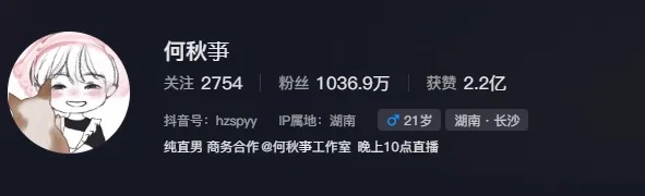 公开资料显示,何秋亊,2003年4月10日出生,抖音平台主播。2023年3月发布的《白毛菠萝咒》作品,因使用猫耳滤镜却化身喊麦高手的反差,在网络上迅速走红,并吸引了大量粉丝。