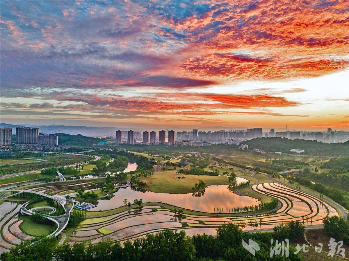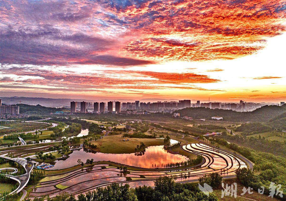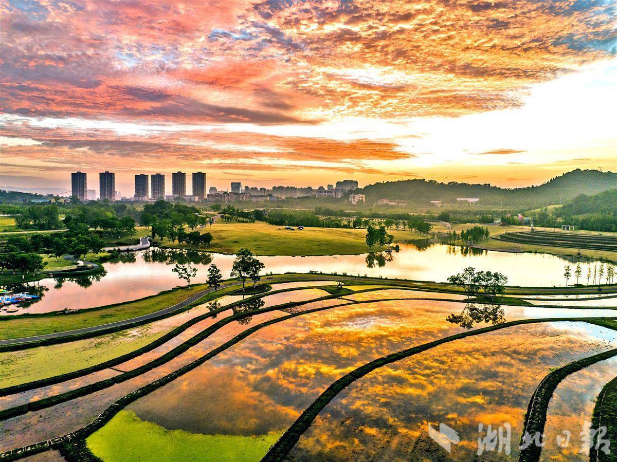 6 月3日清晨,宜昌市卷桥河湿地公园呈现出一幅如诗如画的绝美景象。漫天的朝霞将整个天空染成了热烈的红色,也把卷桥河染得通红,水天融为一体,宛如仙境一般,吸引了众多早起的市民和摄影爱好者驻足观赏、拍照留念。远处,城市的轮廓在朝霞的笼罩下若隐若现,与眼前的湿地稻田景观和谐相融,尽显城市与自然共生的魅力。近年来,宜昌致力于长江岸线生态修复,通过一系列生态保护和修复措施,如今的卷桥河湿地公园,不仅成为市民休闲娱乐的好去处,更是宜昌生态环境持续向好的生动写照。(湖北日报全媒记者 刘曙松 摄)