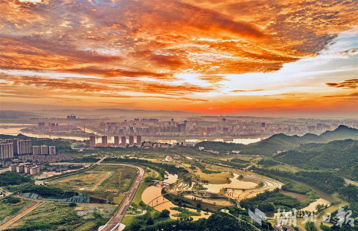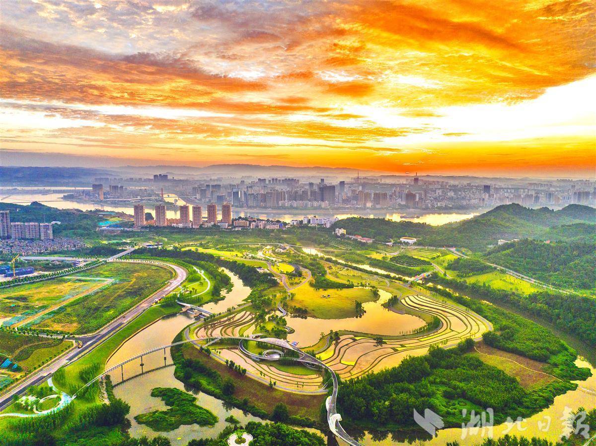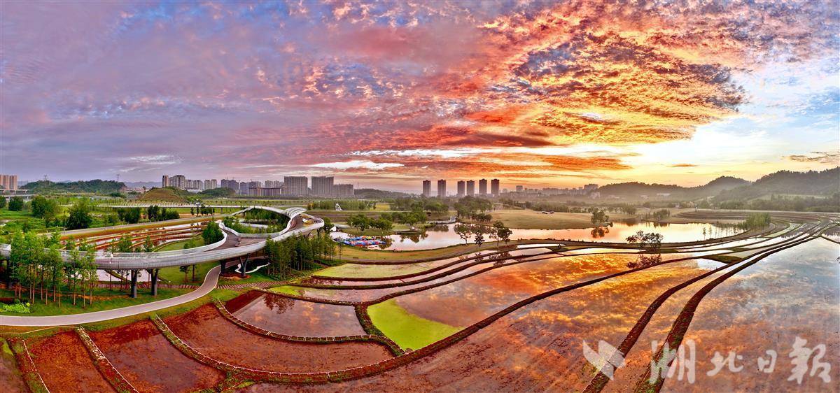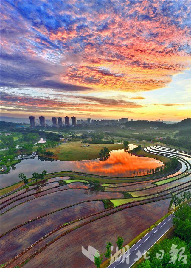 6 月3日清晨,宜昌市卷桥河湿地公园呈现出一幅如诗如画的绝美景象。漫天的朝霞将整个天空染成了热烈的红色,也把卷桥河染得通红,水天融为一体,宛如仙境一般,吸引了众多早起的市民和摄影爱好者驻足观赏、拍照留念。远处,城市的轮廓在朝霞的笼罩下若隐若现,与眼前的湿地稻田景观和谐相融,尽显城市与自然共生的魅力。近年来,宜昌致力于长江岸线生态修复,通过一系列生态保护和修复措施,如今的卷桥河湿地公园,不仅成为市民休闲娱乐的好去处,更是宜昌生态环境持续向好的生动写照。(湖北日报全媒记者 刘曙松 摄)