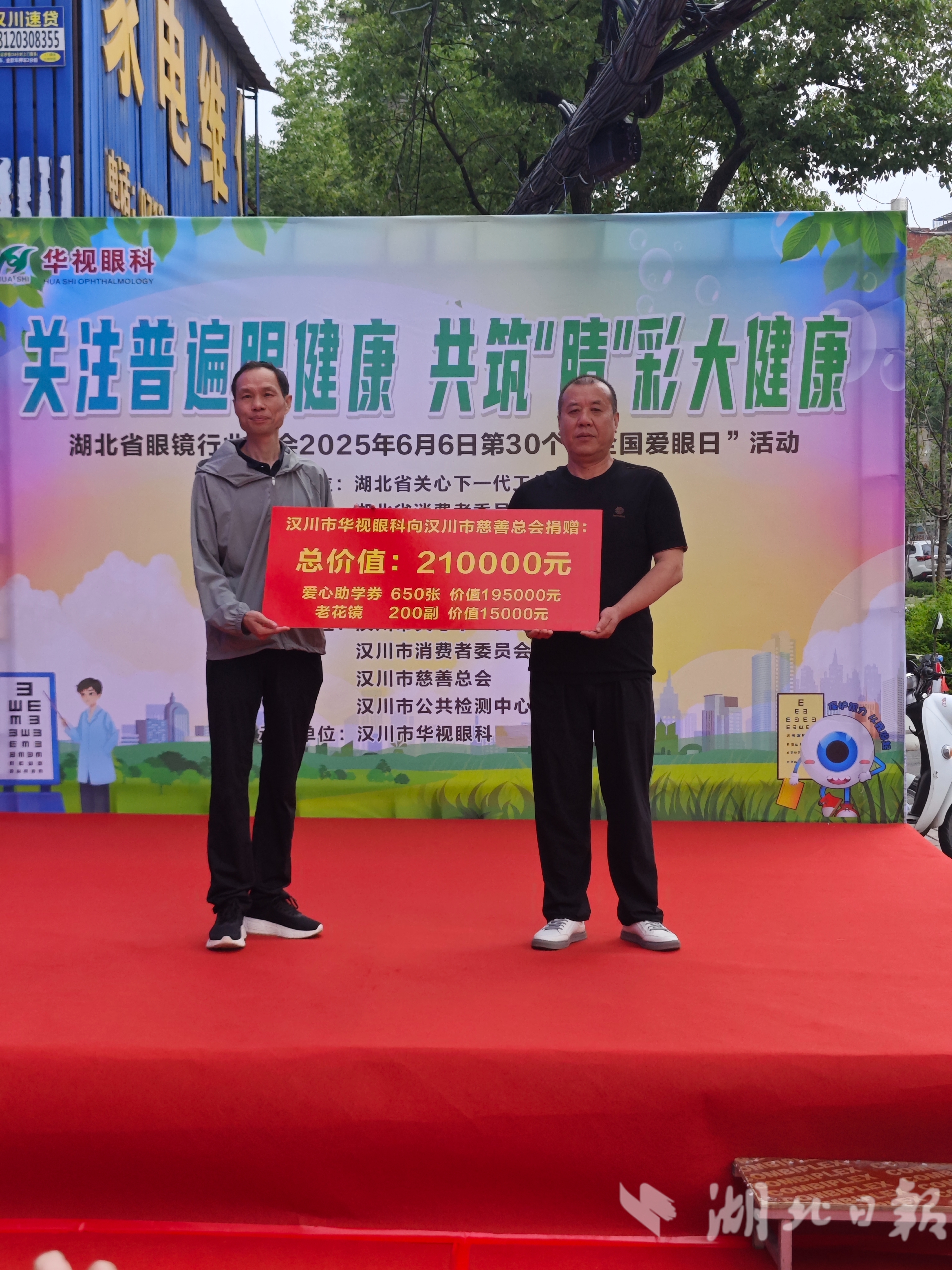 本次活动以“关注普遍的眼健康,共筑‘睛’彩大健康”为主题。支持基层眼健康公益项目,关注老年群体与青少年的视力保护需求,汉川市华视眼科医院院长刘先文代表医院向湖北省慈善总会爱瞳爱心基金捐款1万元,该院门诊部向汉川市慈善会捐赠老花镜等物资,总价值21万元。
