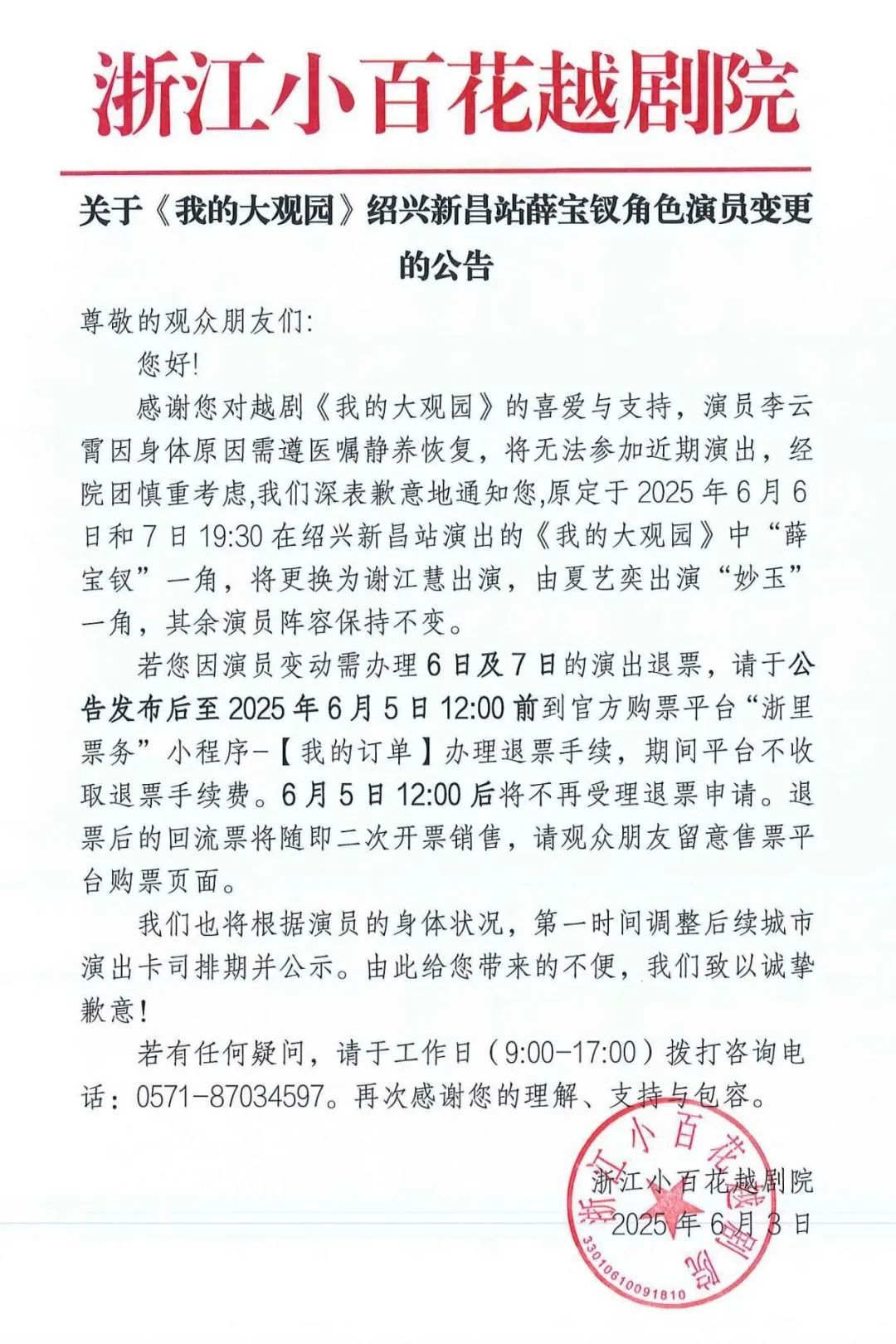 6月3日,浙江小百花越剧院发布《我的大观园》绍兴新昌站薛宝钗角色演员变更的公告,演员李云霄因身体原因需遵医嘱静养恢复,将无法参加近期演出。