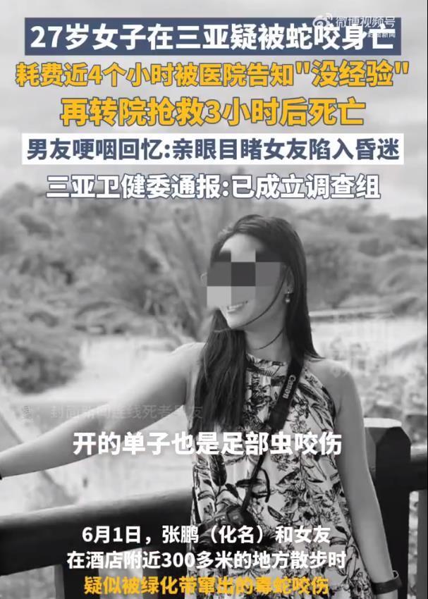 6月3日,一位网友在社交平台发布视频称,自己27岁的妹妹在海南三亚旅游期间疑似被蛇咬伤,于1日晚在三亚市中心医院与三亚市四二五医院接力救治,因抢救无效不幸去世。