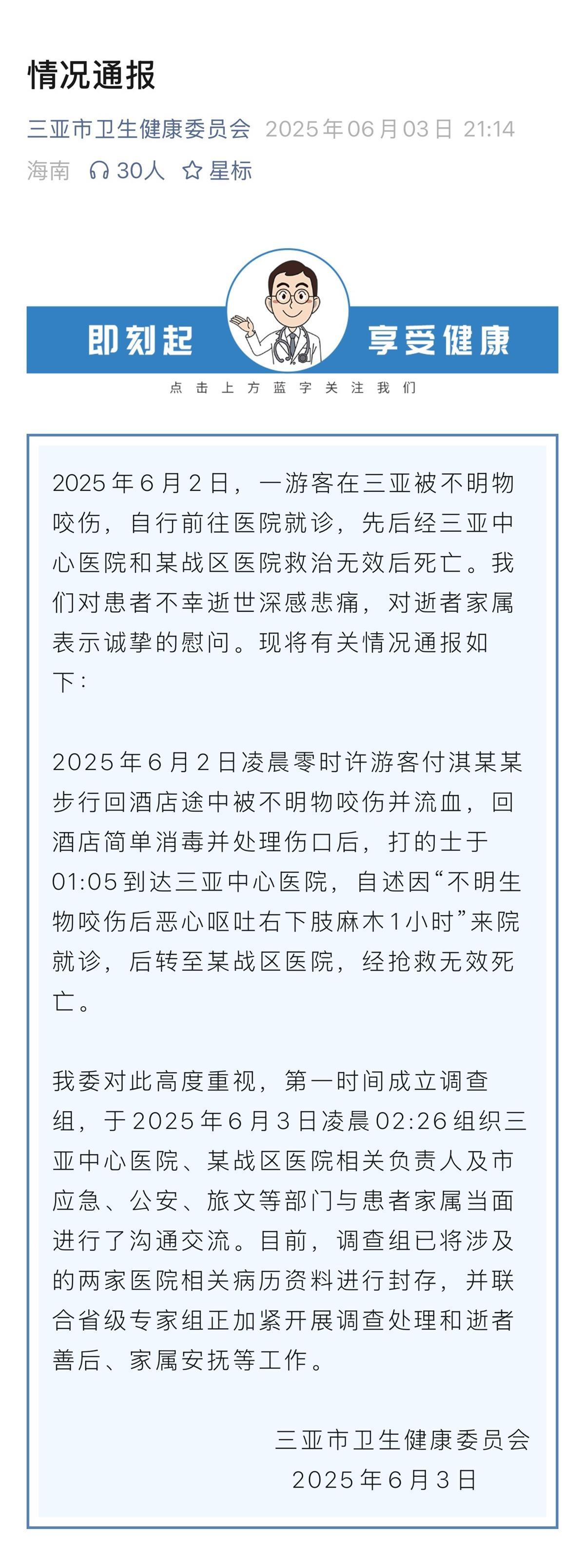 6月3日,三亚市卫生健康委员会通报:2025年6月2日凌晨零时,游客付淇某某在三亚步行回酒店途中被不明物咬伤并流血,自行前往医院就诊,先后经三亚中心医院和某战区医院救治无效后死亡。