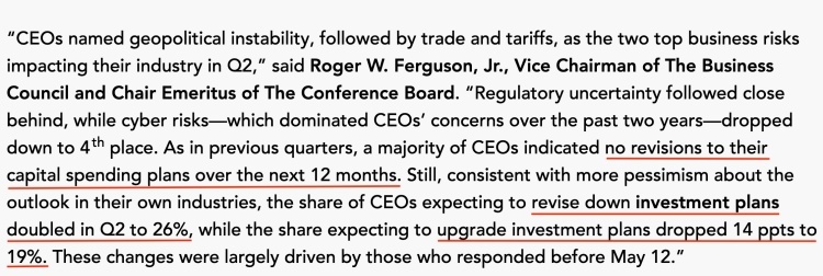 按照他的解释,这些结果表明美国企业界对经济前景的悲观情绪正持续蔓延,反映出他们面对巨大的政策不确定性时,“不知道有哪些规则会对自己公司的运营不利”。