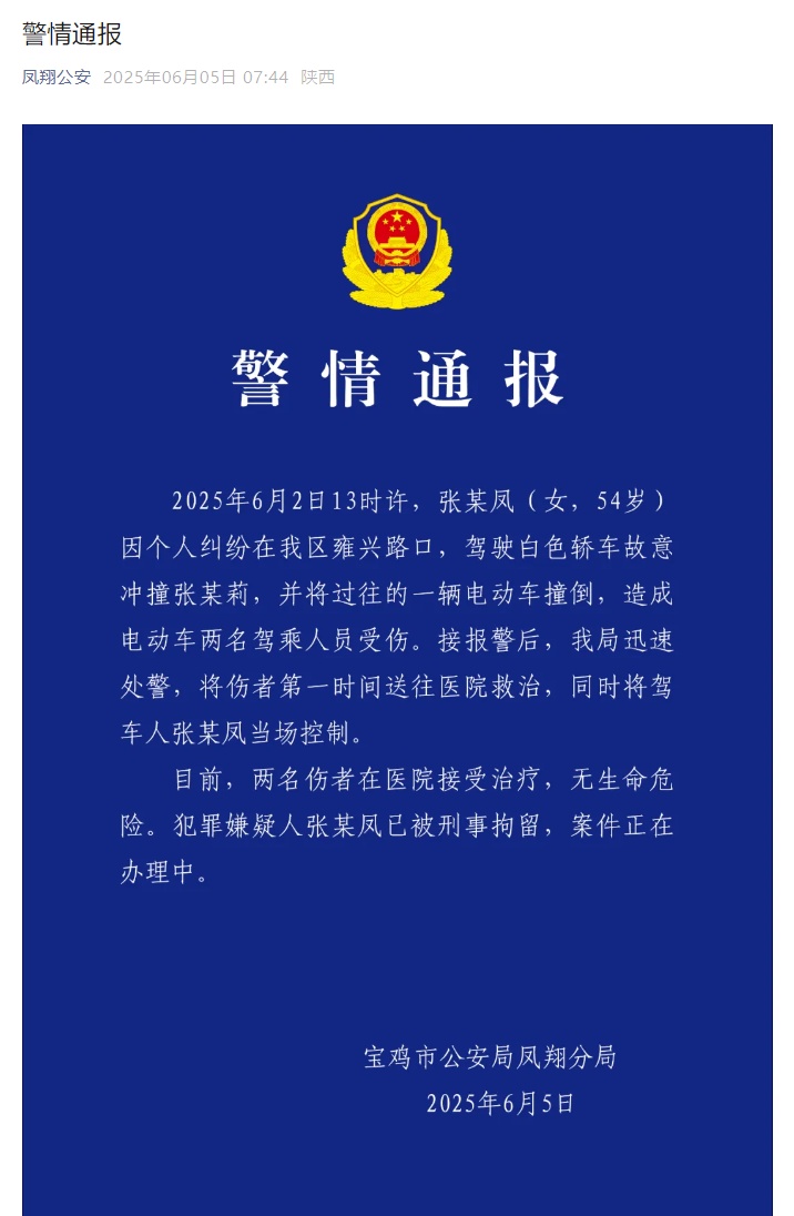 2025年6月2日13时许,张某凤(女,54岁)因个人纠纷在我区雍兴路口,驾驶白色轿车故意冲撞张某莉,并将过往的一辆电动车撞倒,造成电动车两名驾乘人员受伤。接报警后,我局迅速处警,将伤者第一时间送往医院救治,同时将驾车人张某凤当场控制。