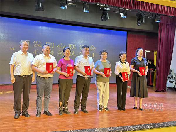 会议在老年大学舞蹈队《爱我中华》的律动中拉开帷幕,随后审议通过《章程》《工作制度》,正式成立“同心联谊会”,并为文化分会、研学分会授牌。歌伴舞《领航》奏响时代强音之际,“五心服务队”同步亮相,由律师、政协委员组成的“同心解铃家”担纲矛盾调解,纳税大户领衔的“同心企明星”赋能经济发展,社会组织组成的“同心社想家”培塑文化生态,高校与媒体构成的“同心智囊团”提供智力支撑,新就业群体组建的“同心先蜂队”扎根基层服务,形成专业力量和多元主体的治理矩阵。