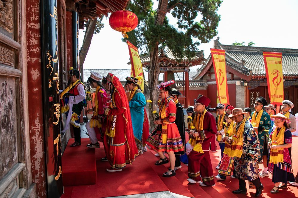 2023年,各界人士代表参加完公祭伏羲大典后进入伏羲庙献花。新华社记者 郎兵兵 摄