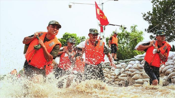 东部战区陆军某舟桥旅重舟一营官兵运送沙袋加固堤坝。 (新华社资料图)