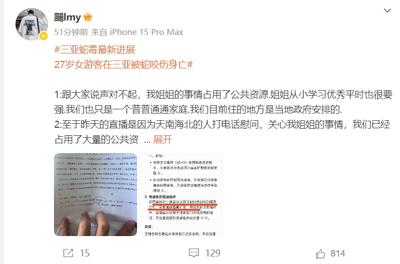 6月6日 ,当事人弟弟@颺lmy 发文最新进展:在此我可以跟大家负责任的说,在整个过程中医院错误的把生理盐水注射到我姐姐的血液里,导致了血液里的毒素加速扩散。至于大家问的尸检,已经有了死亡诊断,确认为:右足第二趾为咬伤(神经毒蛇),心脏呼吸骤停后呼吸衰竭。