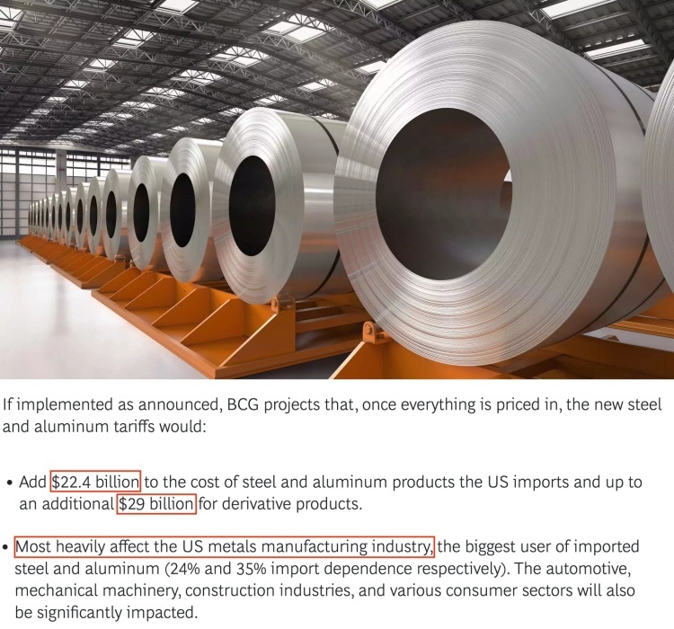 根据美国波士顿咨询公司的测算,仅在3月生效的25%钢铝关税就会让美国进口钢铁和铝产品的成本增加224亿美元,衍生产品的成本增加290亿美元。
