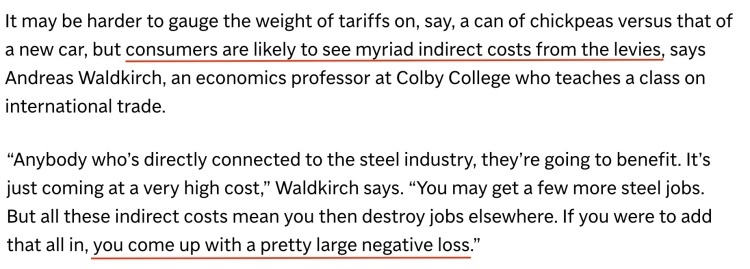 美国科尔比学院经济学教授安德烈亚斯•瓦尔德基希说,也许很难判断对一盒鹰嘴豆罐头和一辆新车征收关税的影响大小,但消费者会切身感受到关税带来的无数间接成本。