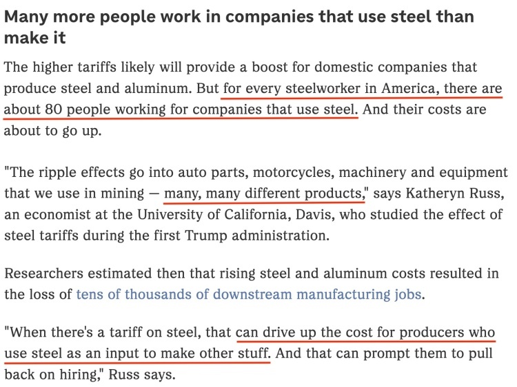 “当对钢铁征收关税时,这可能会推高使用钢铁(材料)制造其他产品的生产商的成本,并可能会促使这些生产商减少招聘。”