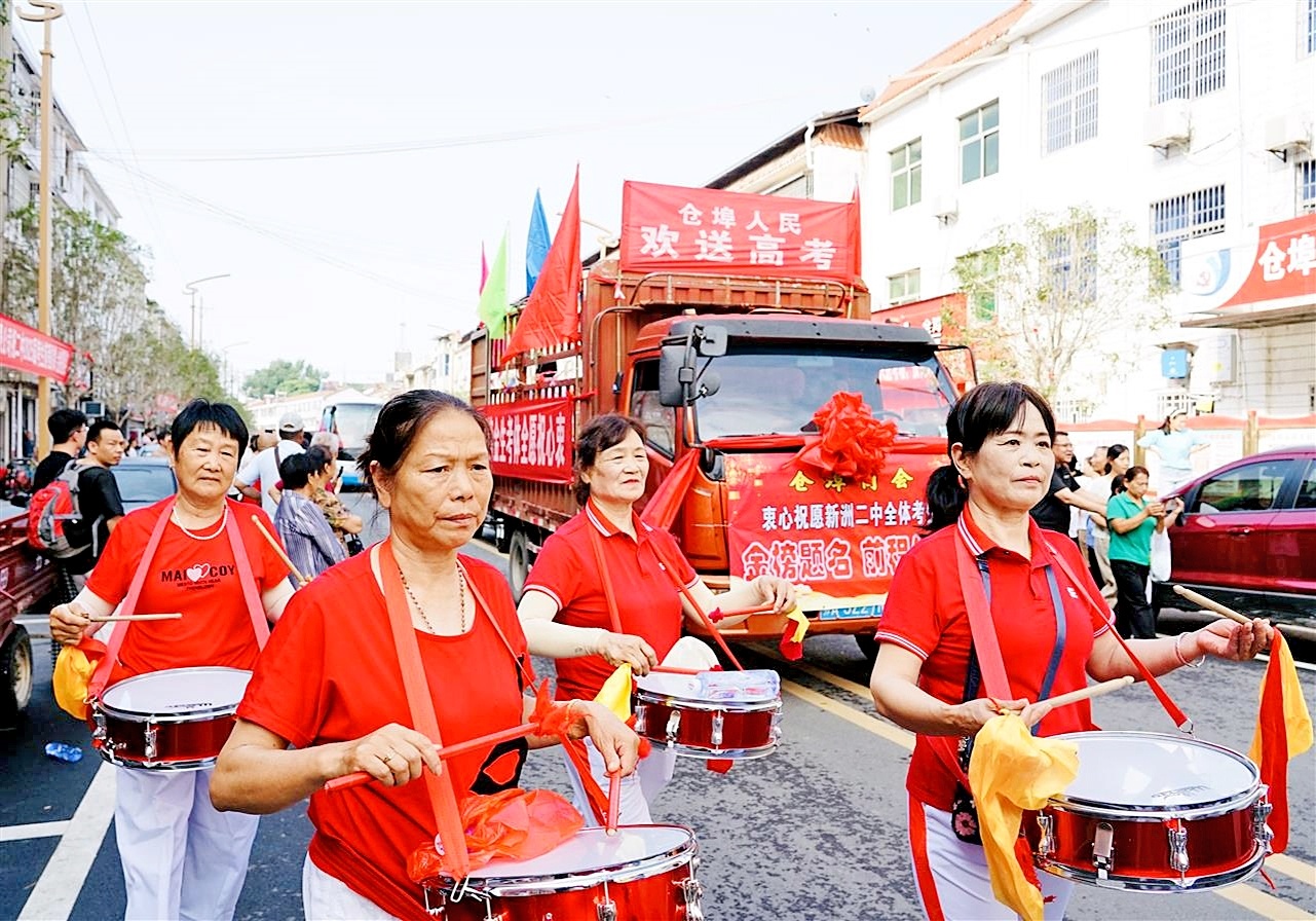 6月6日清晨8点08分,武汉新洲二中校门打开,二十余辆载着高考学子的大巴在警车引领下缓缓驶出,一时间,彩旗翻飞,锣鼓声震,仓埠街中心幼儿园的孩子们擂响战鼓,老年大学方阵挥舞花棍,跑旱船的民俗画卷迤逦展开。马路两侧,百米长街化为人潮涌动的祝福长廊,“金榜题名”的横幅猎猎招展,数万居民夹道而立,挥手、呐喊,为奔赴高考考场的家乡子弟们鼓劲壮行。