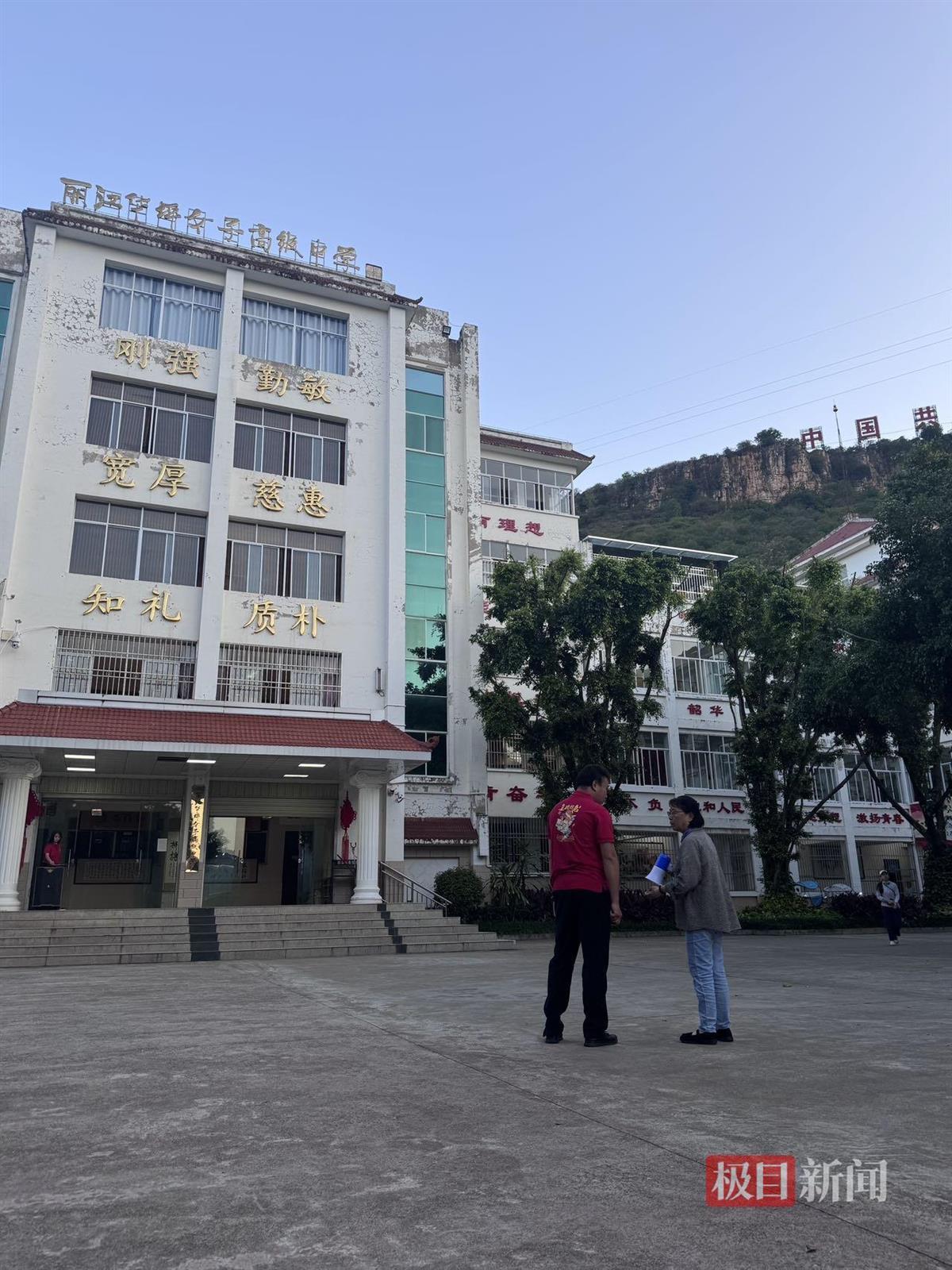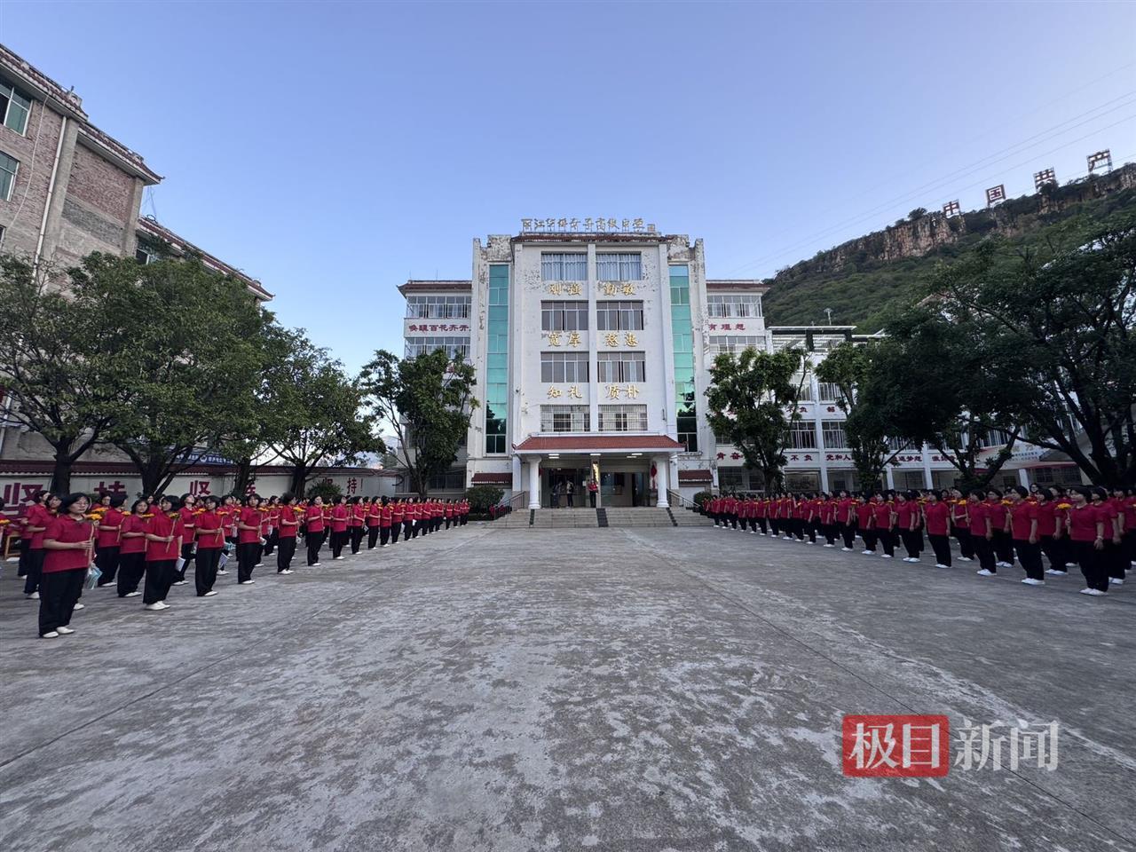 华坪女高全校师生在教学楼前整齐排列