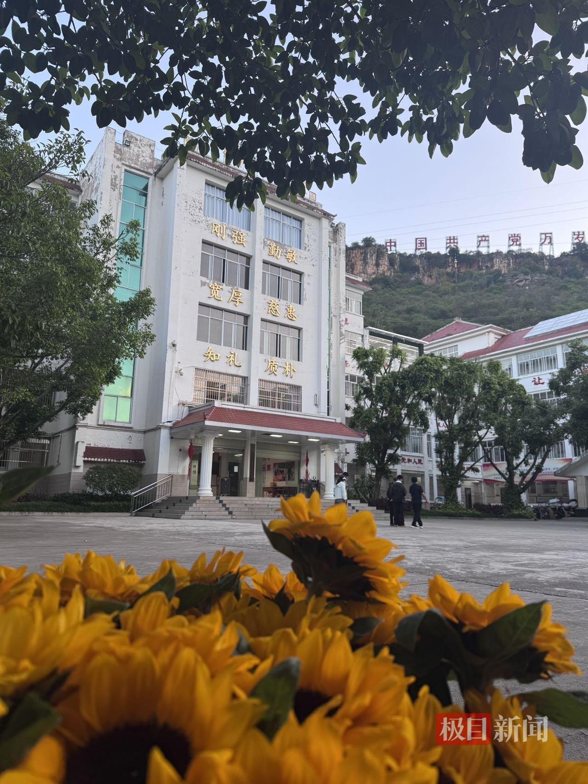 送考仪式上,华坪女高全校师生挥舞着向日葵,一起合唱《万疆》和《英雄赞歌》,还有老师穿上旗袍与消防员跳着青春洋溢的舞蹈,为高三考生们加油打气。