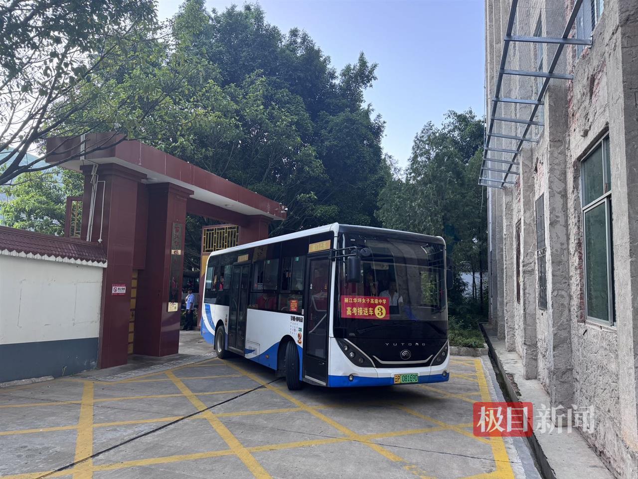 在高一高二年级同学一声声“高三加油!”的打气加油声中,张桂梅与考生们一起登上了高考接送车。7时许,六辆送考车驶出华坪女高的校门,载着高三学生出发前往考点县一中。