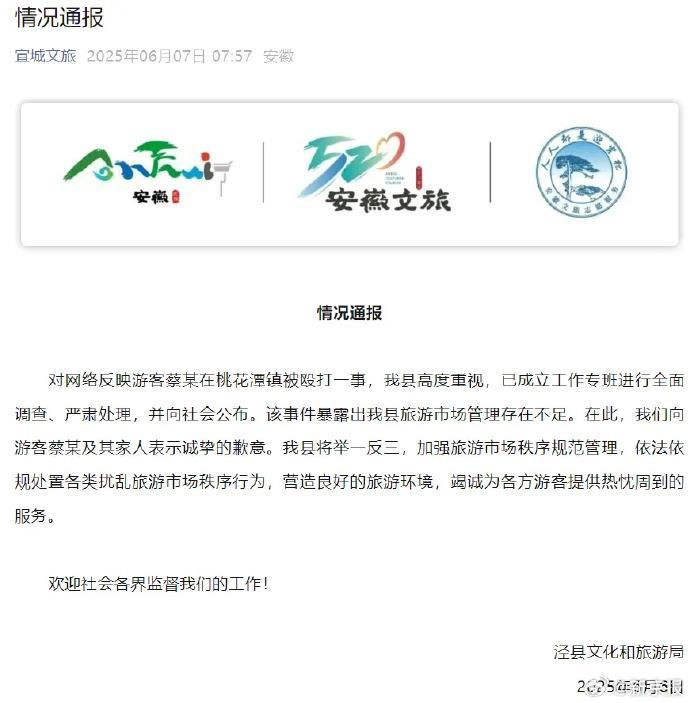 安徽宣城市泾县文化和旅游局6月6日发布情况通报称,向游客蔡某及其家人表示诚挚的歉意,该县已成立工作专班进行全面调查,并会严肃处理。(据6月7日澎湃新闻)