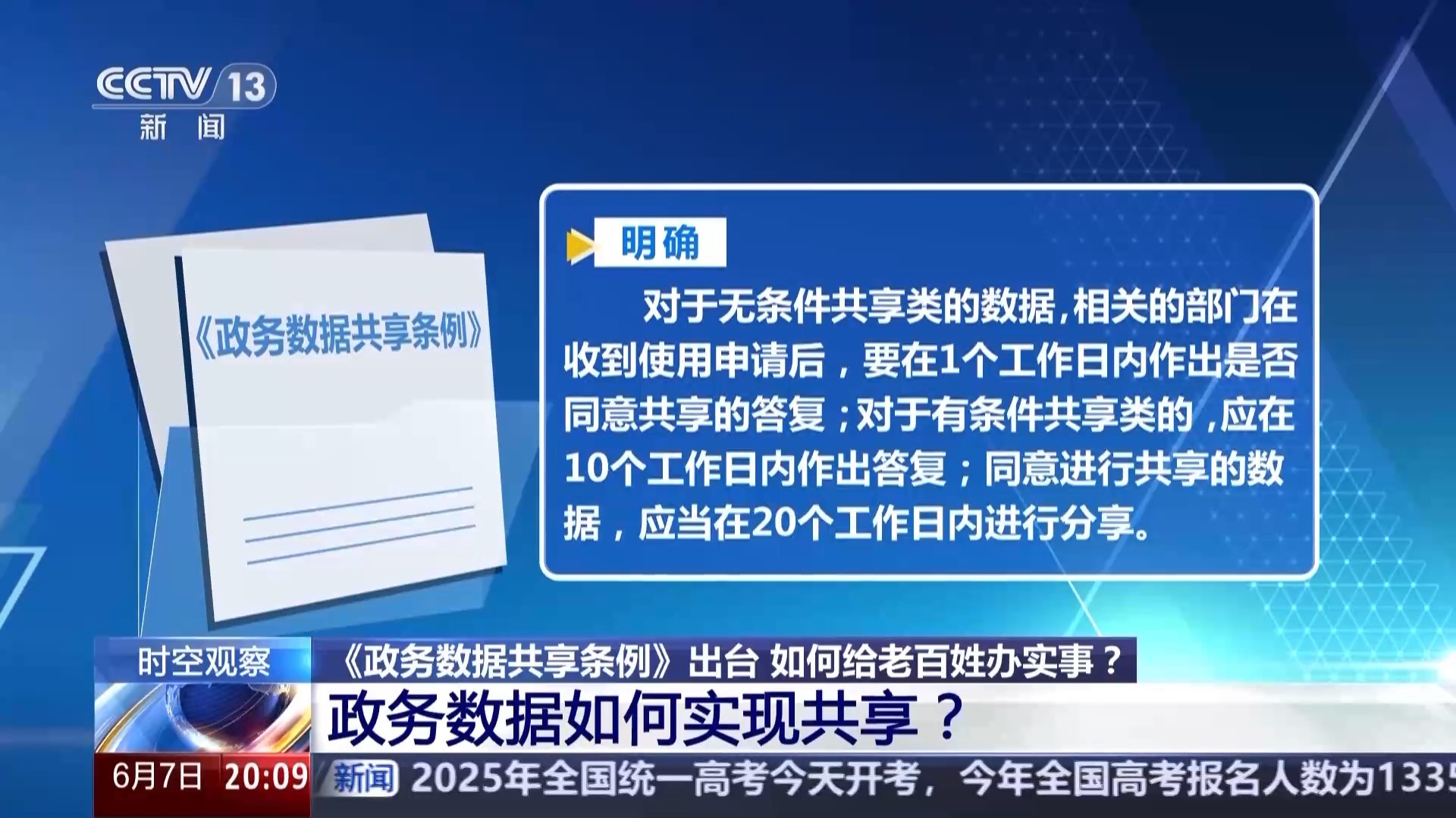 近日,《政务数据共享条例》正式出台,对政务数据的目录管理、共享使用、平台支撑等工作进行部署。目的是推进政务数据安全有序高效共享利用,提升政府数字化治理能力和政务服务效能,全面建设数字政府。政务数据为什么要共享?如何实现共享?去年以来,国家数据局累计发布了70个公共数据“跑起来”示范场景,助力产业发展、社会治理、民生改善。政务数据“跑”起来,带来了哪些变化?全面建设数字政府如何给老百姓办实事?