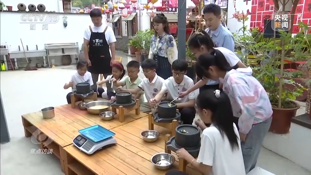 在动漫节期间,在下姜村还推出了“跟着动画去旅行”的活动。在下姜村三部动画作品中,沼气池、豆腐坊都是标志性场景,小朋友们循着动画足迹,实地探访打卡,他们在拼图接力、磨豆浆等活动中,体验了生态治理的成果,了解了现代乡村的样貌。