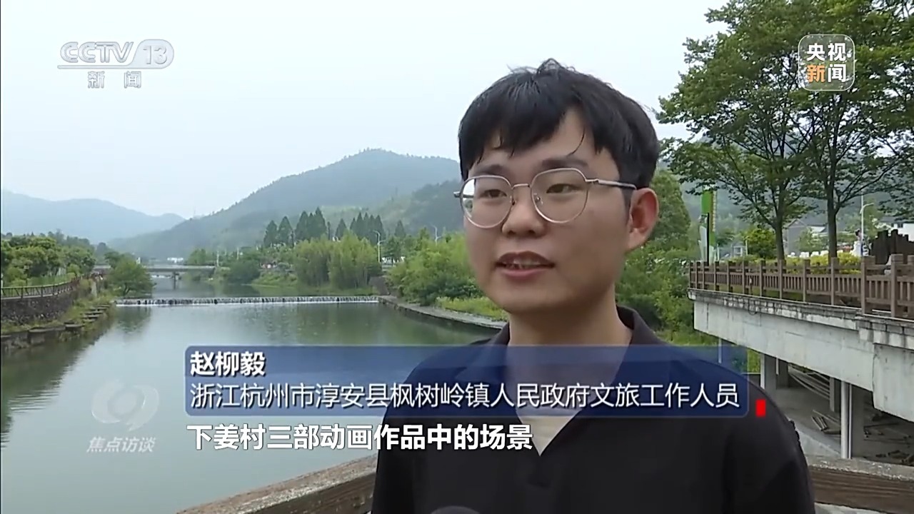 浙江杭州市淳安县枫树岭镇人民政府文旅工作人员 赵柳毅:下姜村三部动画作品中的场景都来自下姜村实景,许多游客也专程来到下姜寻找动画里的经典场景打卡。接下来,我们也将选取动画中最具有代表性的场景串联成旅游线路。