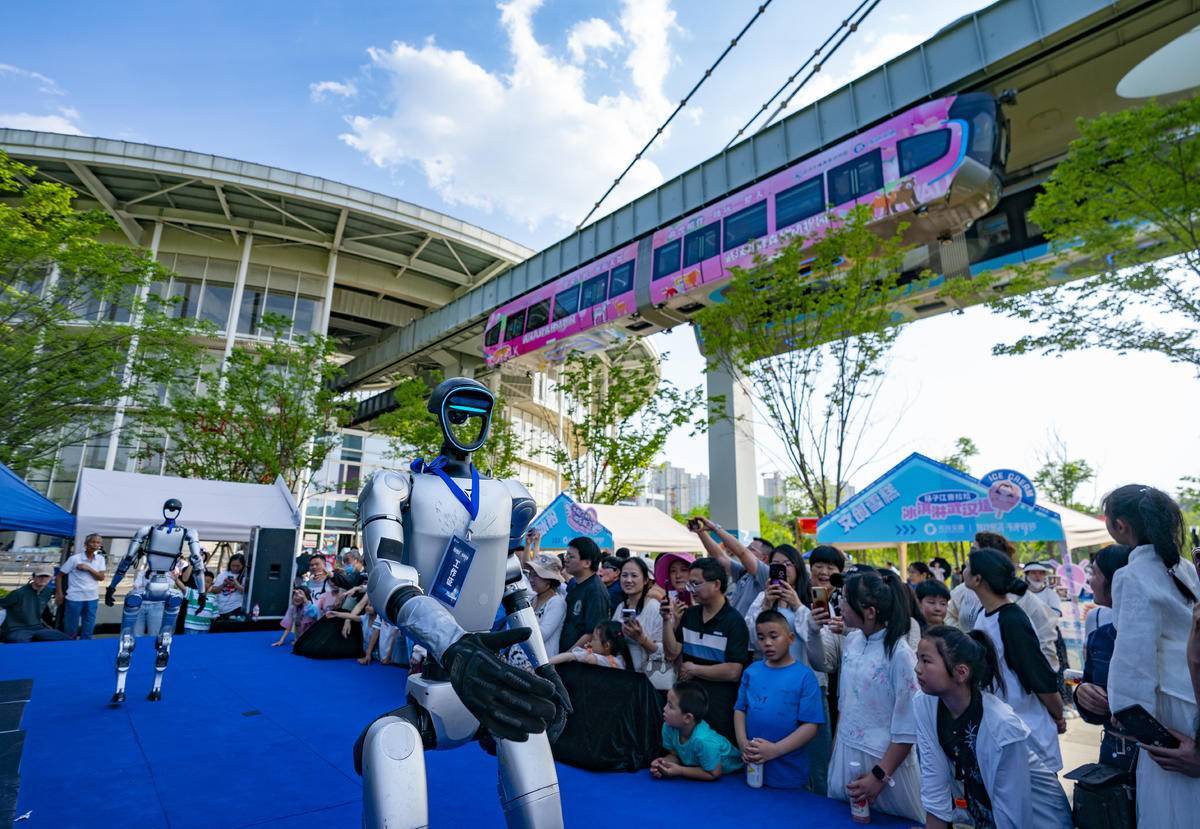 5月1日,光谷空轨高新大道站,两台人形机器人身着未来感十足的银色战甲,向每一位游客伸出热情的“手”。(湖北日报全媒记者 魏铼 摄)