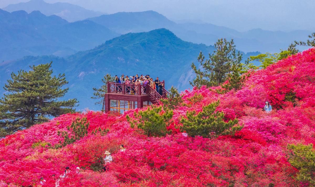 位于大别山腹地的麻城龟峰山上野生杜鹃花盛放,吸引各地游客游玩。(湖北日报全媒记者 薛婷 摄)