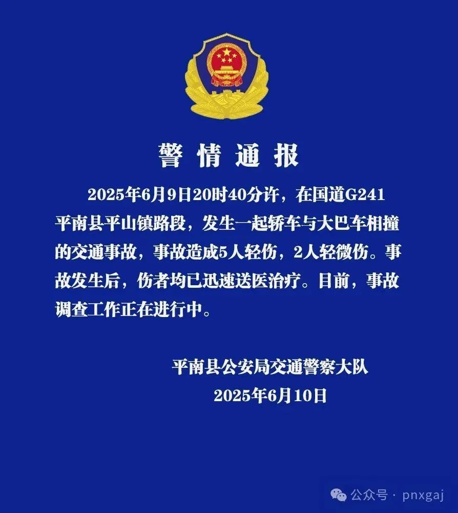 6月10日,广西贵港市平南县公安局交通警察大队发布通报:6月9日20时40分许,在国道G241平南县平山镇路段,发生一起轿车与大巴车相撞的交通事故,事故造成5人轻伤,2人轻微伤。事故发生后,伤者均已迅速送医治疗。目前,事故调查工作正在进行中。