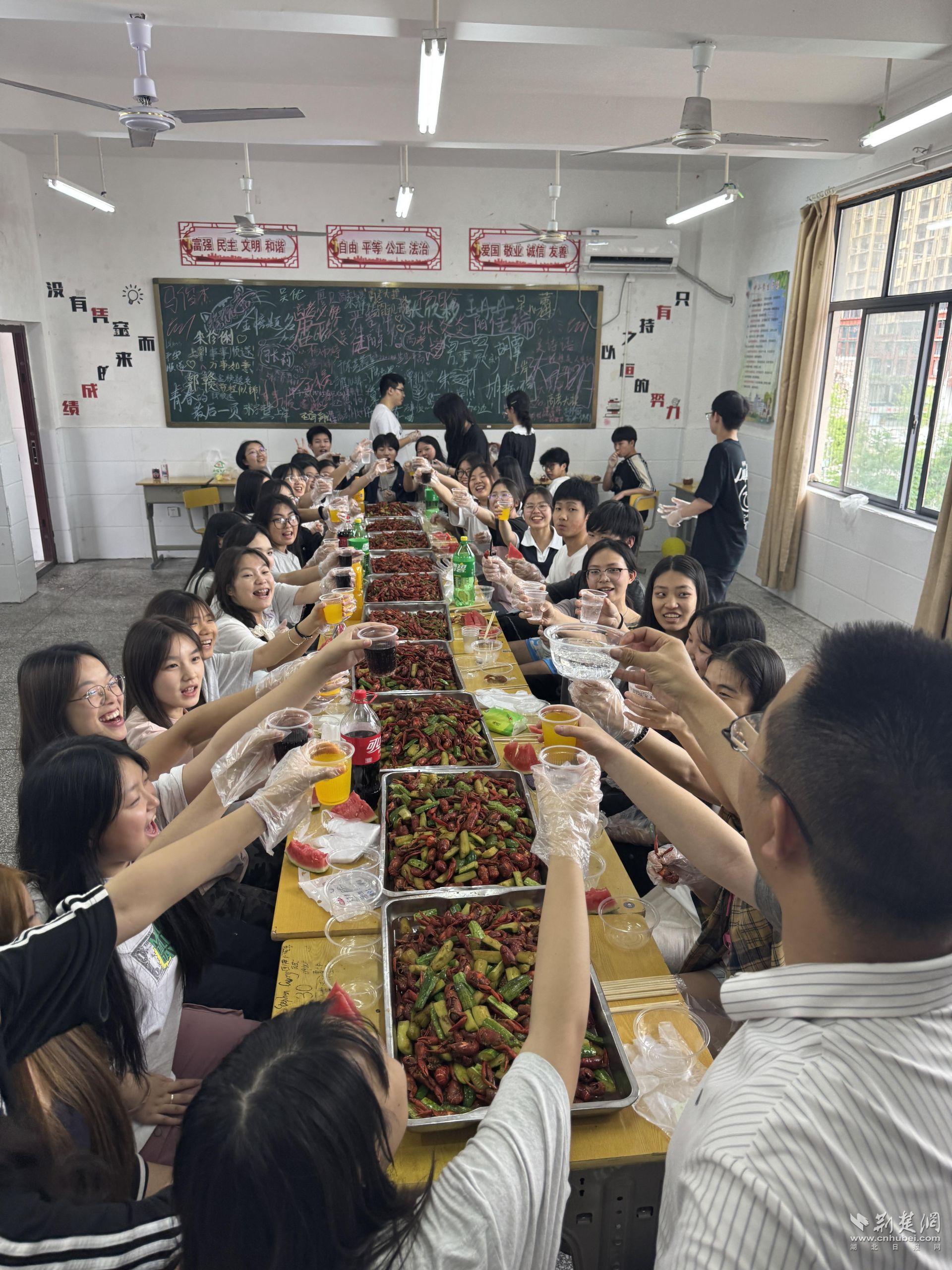 荆楚网(湖北日报网)讯(记者:税浪 通讯员:王晶梅、谭覃 视频剪辑:王会)学生在考场写青春答卷,老师在教室做龙虾盛宴!6月9日,湖北恩施市平高实验学校高三一班班主任自费购买150斤小龙虾、饮料、水果等,亲自下厨烹饪,前前后后花了八小时只为在学生高考结束送上最特别的离别龙虾宴!