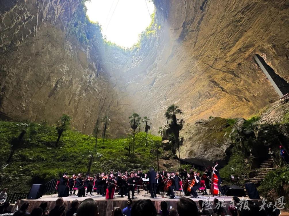 宣恩县党员干部打破常规思维“封印”,在矅天眼景区举办“天坑交响音乐会”,让古典乐章回荡在290米深的天然“音乐厅”,吸引央视等主流媒体关注。