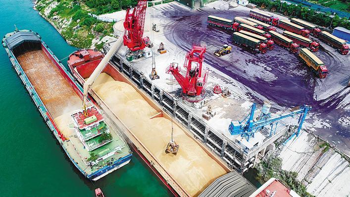 6月11日,荆州市李埠镇长江岸边的巍宏码头,夏粮转运工作正紧张进行。每日约100辆大型卡车装载着产自湖北及河南等地的小麦抵达码头,日转运上船量达5200至7800吨。目前,这批粮食主要运往重庆、四川长江沿线粮库以及云南、贵州部分国家直属库。江汉平原作为粮食主产区,荆州依托长江水道和先进自动化运输线,为码头的粮食运输提供有力保障。(湖北日报全媒记者 刘曙松 通讯员 肖敏 摄)