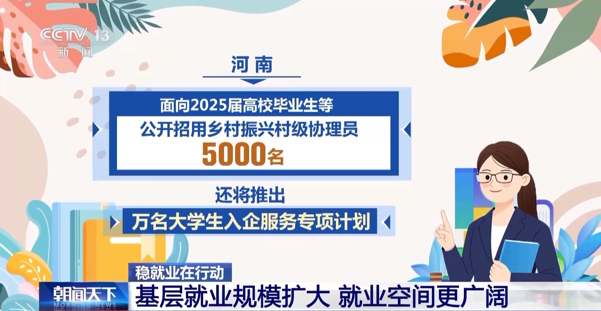 据介绍,河南面向2025届高校毕业生等公开招用乡村振兴村级协理员5000名,还将推出万名大学生入企服务专项计划。内蒙古已推出“社区民生工作志愿者服务计划”,面向全区招募社区民生工作志愿服务人员5000人。宁夏实施“基层服务专项计划”,每年招募2000名高校毕业生。