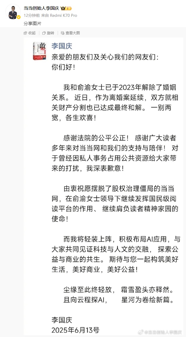 6月13日,@当当创始人李国庆 发文,宣布与俞渝已于2023年解除婚姻关系,双方就财产分割达成最终和解。