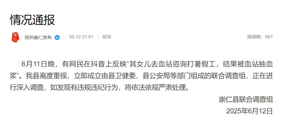 6月11日晚,有网民在抖音上反映“其女儿去血站咨询打暑假工,结果被血站抽血浆”。我县高度重视,立即成立由县卫健委、县公安局等部门组成的联合调查组,正在进行深入调查,如发现有违规违纪行为,将依法依规严肃处理。