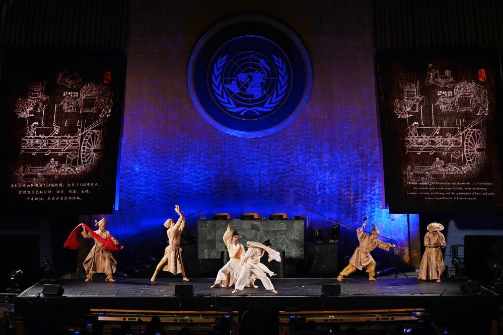 6月9日,在位于纽约的联合国总部,演员在“跨越山海的文明对话”专场文艺演出上表演舞剧《天工开物》选段。新华社记者 李睿 摄