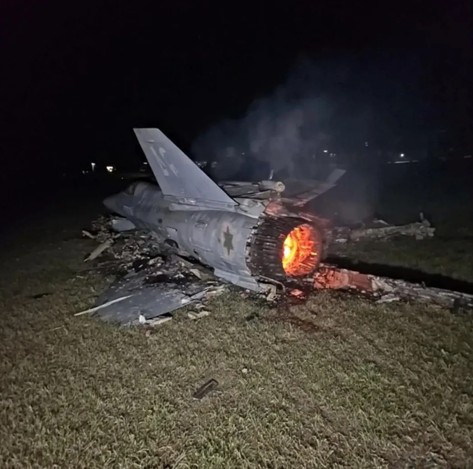 照片于夜间拍摄。照片中,战机残骸仍在燃烧,机上印有以色列空军标志。