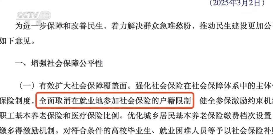 一段时间以来,国家正在陆续出台一系列重要政策,为户籍与社保松绑。党的二十届三中全会明确提出,要“全面取消在就业地参保户籍限制”。本周一,中办、国办发布的《关于进一步保障和改善民生 着力解决群众急难愁盼的意见》,这一表述再次被提及。