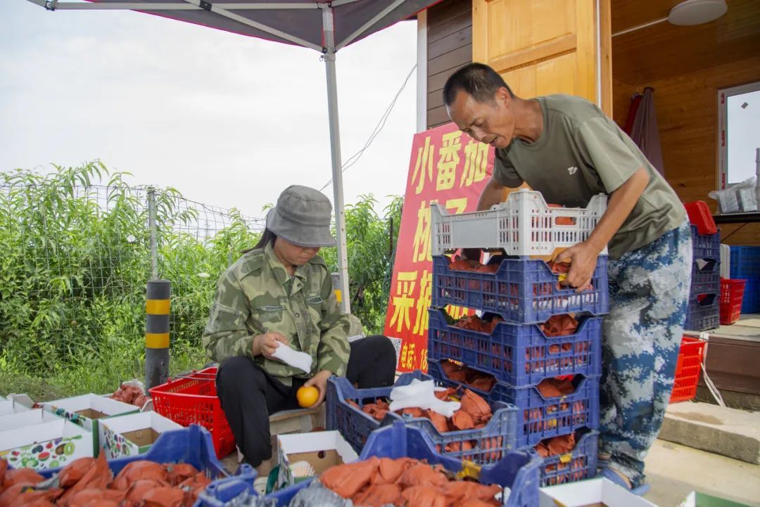 2012年,冯勇和王征先后来到黄陂发展种养殖业,经过几年的摸索与实践,于2018年成功成立了桃源记果园。“区农技中心的专家经常来指导,我们自己也跟着网课学。”王征擦了把汗笑着说,“如今采摘园规模已达35亩,种植了桃子、番茄、葡萄等多个品种,从5月到10月,每月都有新鲜果蔬可供游客采摘!”