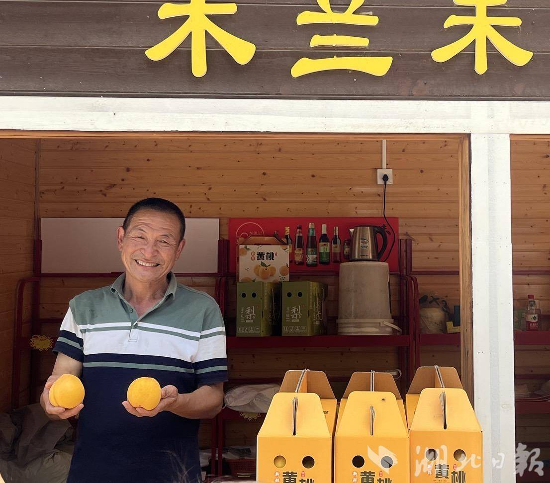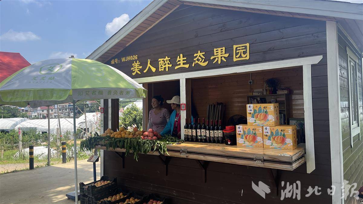 售卖亭上,挂着由政府统一设计的招牌。“通过招牌,客人在地图上一搜索就能定位到我们。”曾在杭州打拼多年的胡德文,看准家乡火塔线沿线的旅游潜力,与姐姐回乡承包60亩地,种植黄桃、水蜜桃等,却因没有固定门面,难以在线下拓展顾客。如今,姐弟俩的售卖亭不仅陈列鲜果和自酿果酒,更将其打造成集线下销售、线上运营于一体的多功能空间。