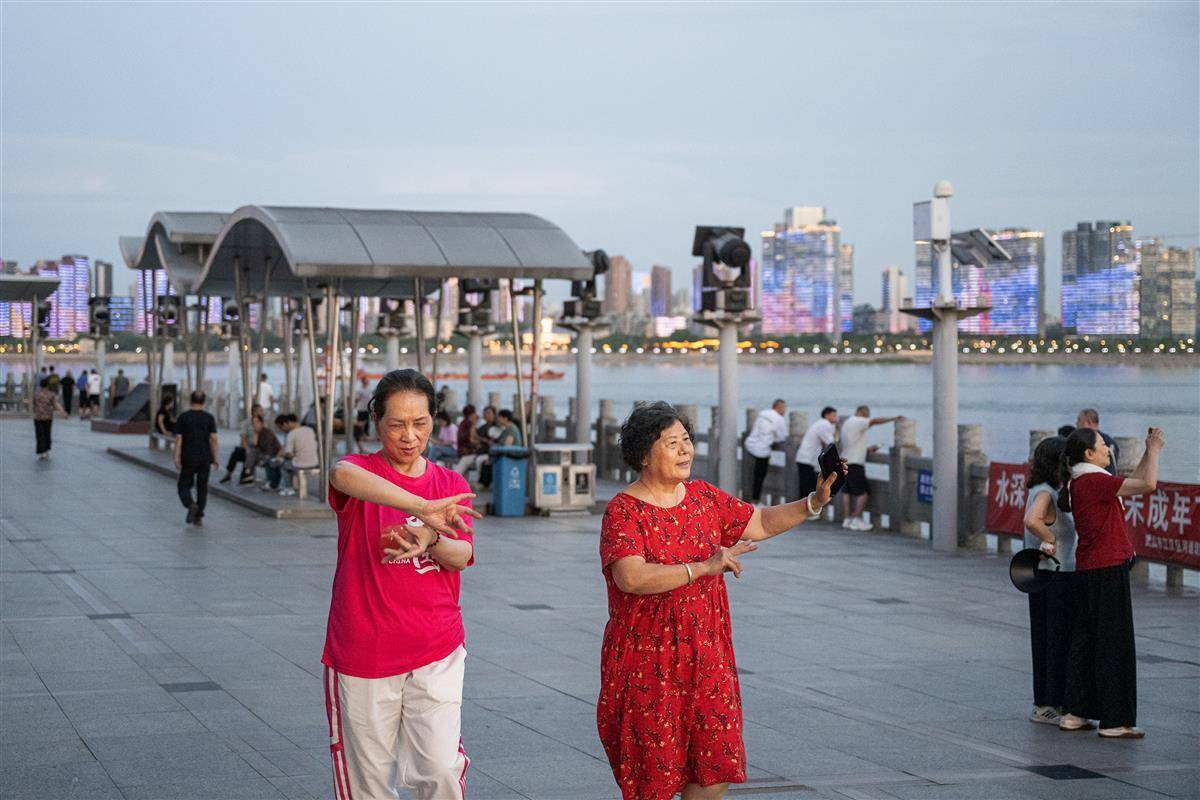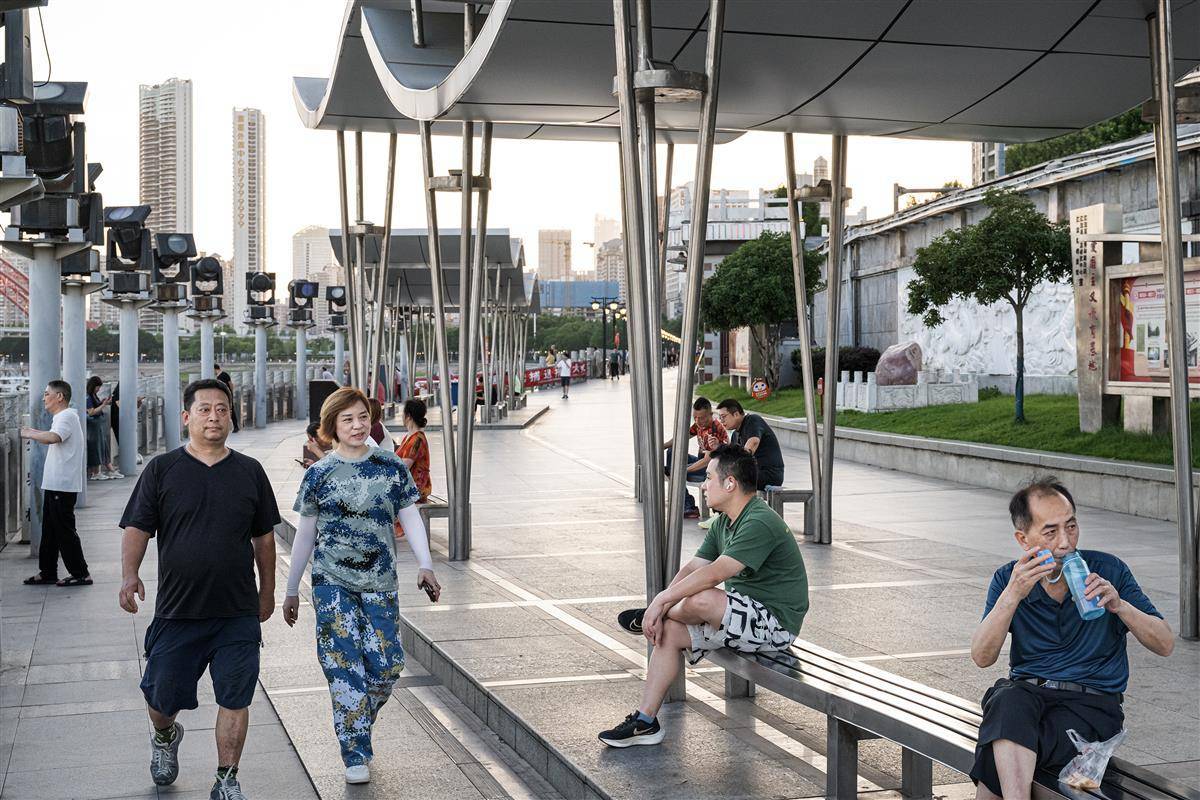 6月15日傍晚,在武汉市龙王庙闸口,市民在江边乘凉赏江景。(湖北日报全媒记者 任勇 摄)