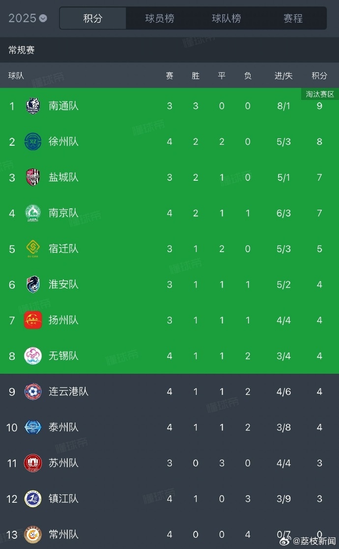 6月15日,江苏省城市足球联赛第四轮比赛结束,常州连输四场坐实“十三妹”,苏州连平三场继续倒数第三,无锡跃升至第八,南通仍是第一,徐州升至第二。
