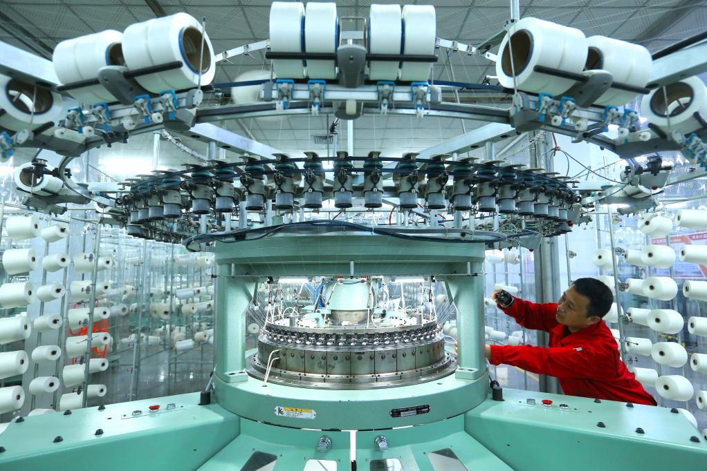 5月19日,山东省青岛市即墨区龙山街道一家纺织企业的工人在生产出口海外市场的服装面料。新华社发(梁孝鹏 摄)