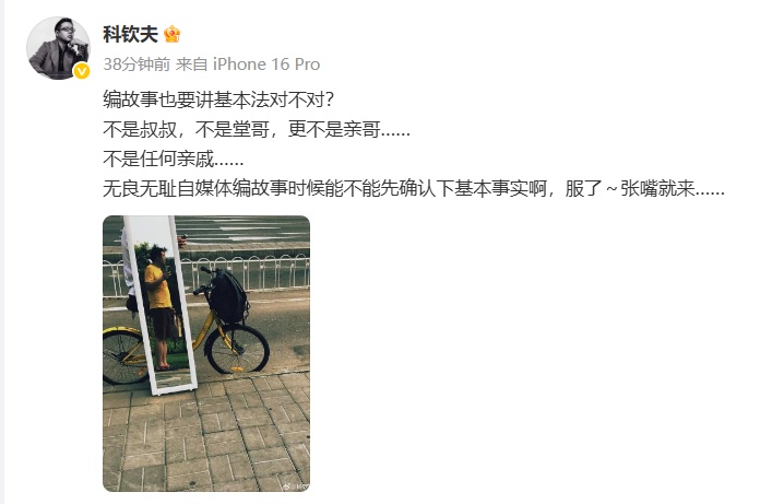随后@科钦夫 发文回应,“编故事也要讲基本法对不对?不是叔叔,不是堂哥,更不是亲哥,不是任何亲戚。”