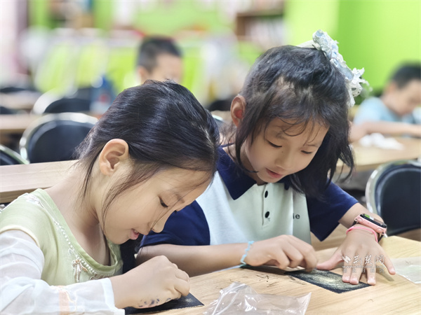 小朋友们体验打磨琥珀化石。 通讯员供图