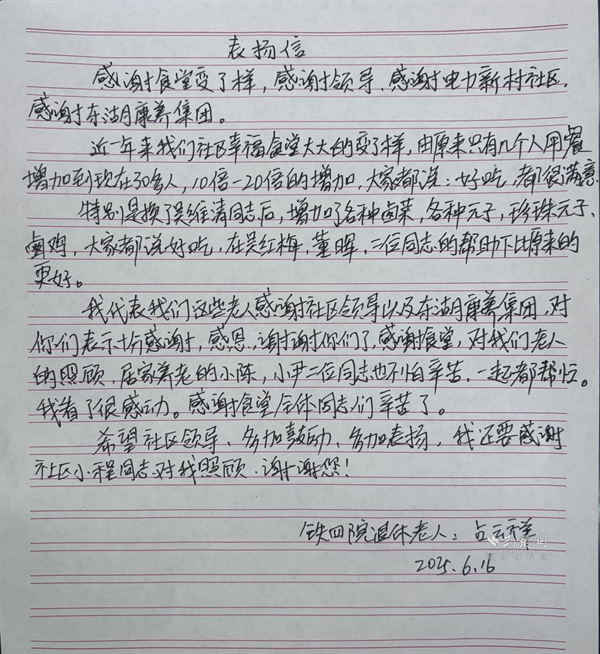 荆楚网(湖北日报网)讯(通讯员 张芳蕾)“现在的幸福食堂大变样,饭菜种类多,味道好,我们这些老人都很满意!”6月17日上午,91岁退休老人亲手将一封手写感谢信送到杨园街道电力新村社区。字里行间满是对幸福食堂、东湖康养集团及社区工作人员的谢意。这封朴实的信件,不仅是一位长者的心声,更折射出社区为老服务的暖心升级。