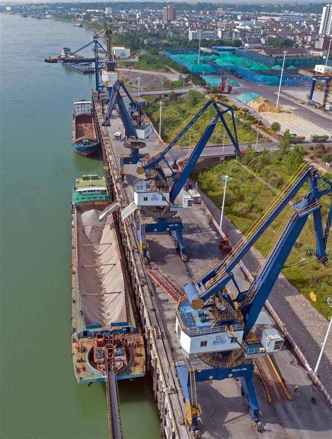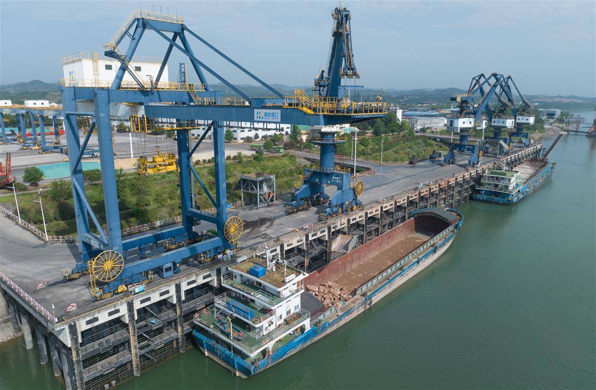6月16日,宜都市长江岸边的宜都港码头一派繁忙景象。货轮在泊位上有序装卸物,运输车辆往来穿梭。一批卵石和抛江石正通过港口装船,即将顺流而下运往荆州市。作为宜昌市首个智能码头,宜都港总岸线618米,拥有4个泊位。 通过智能远控系统,港口码头作业区可实现场地内无人值守,智能化装卸设备24小时运行,年吞吐能力可达300万吨。更引人注目的是,由宜都市交通部门牵头打造的“水陆联运”网络,使宜都港货物可高效连接长江中游城市群和成渝经济带,实现无缝转运。今年以来,宜都港货物吞吐能力持续释放。 截至5月,港口营收同比增长46.65%。港口还主动对接宜涪高铁、荆江航道整治等重大工程,成功引入黄砂、船用钢板、重型港机部件等新货源,预计全年将新增吞吐量超40万吨。(湖北日报全媒记者 刘曙松 通讯员 黎文来 摄)