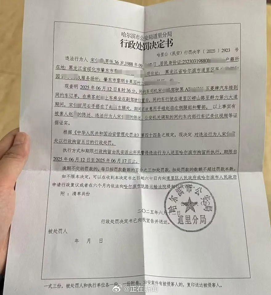 6月17日,哈尔滨的赵女士发帖称乘坐T3出行网约车时遭到司机猥亵,警方对司机作出行政拘留5日处罚,平台曾以保密为条件提出3000元补偿,但被她拒绝。