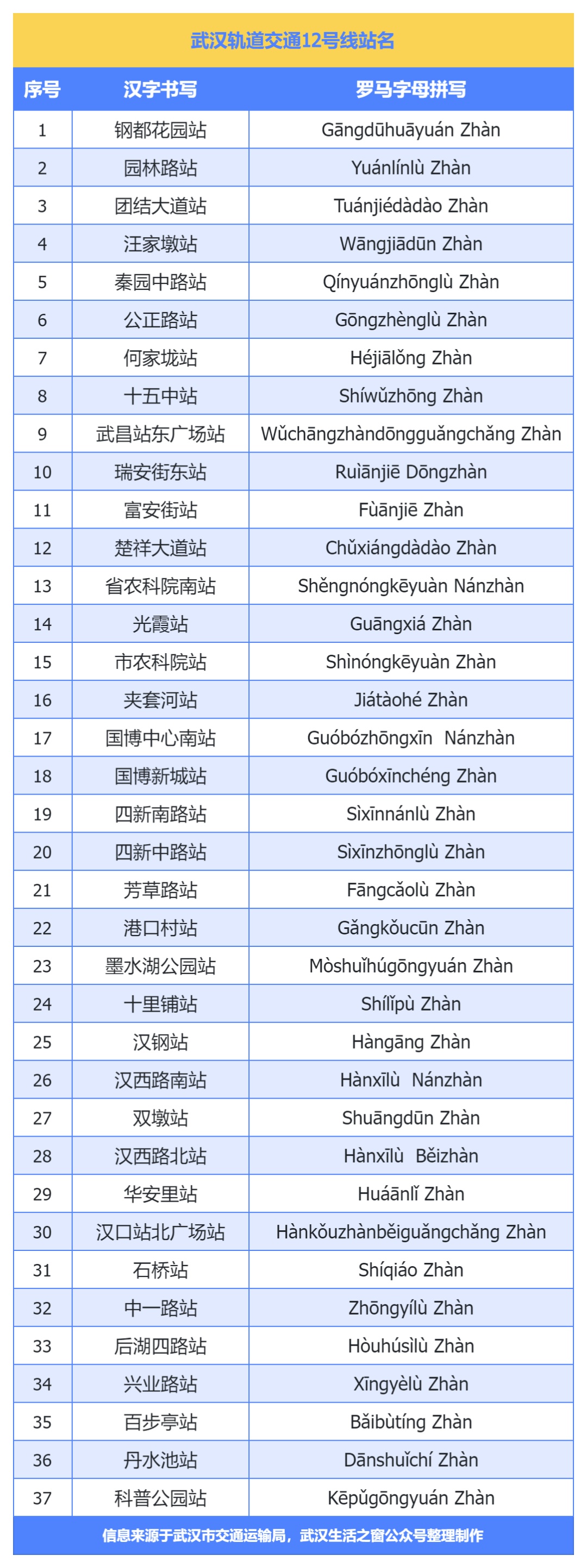目前,12号线工程正在建设中。结合工程建设进度和运营筹备需要,根据《地名管理条例》(国务院令第753号)和《武汉市轨道交通车站命名规则》(武交规〔2024〕1号)规定,武汉轨道交通 12号线站名经公开征求意见、专家论证、综合评审、批准实施和备案等程序,已完成站名命名工作,现将站名通告如下: