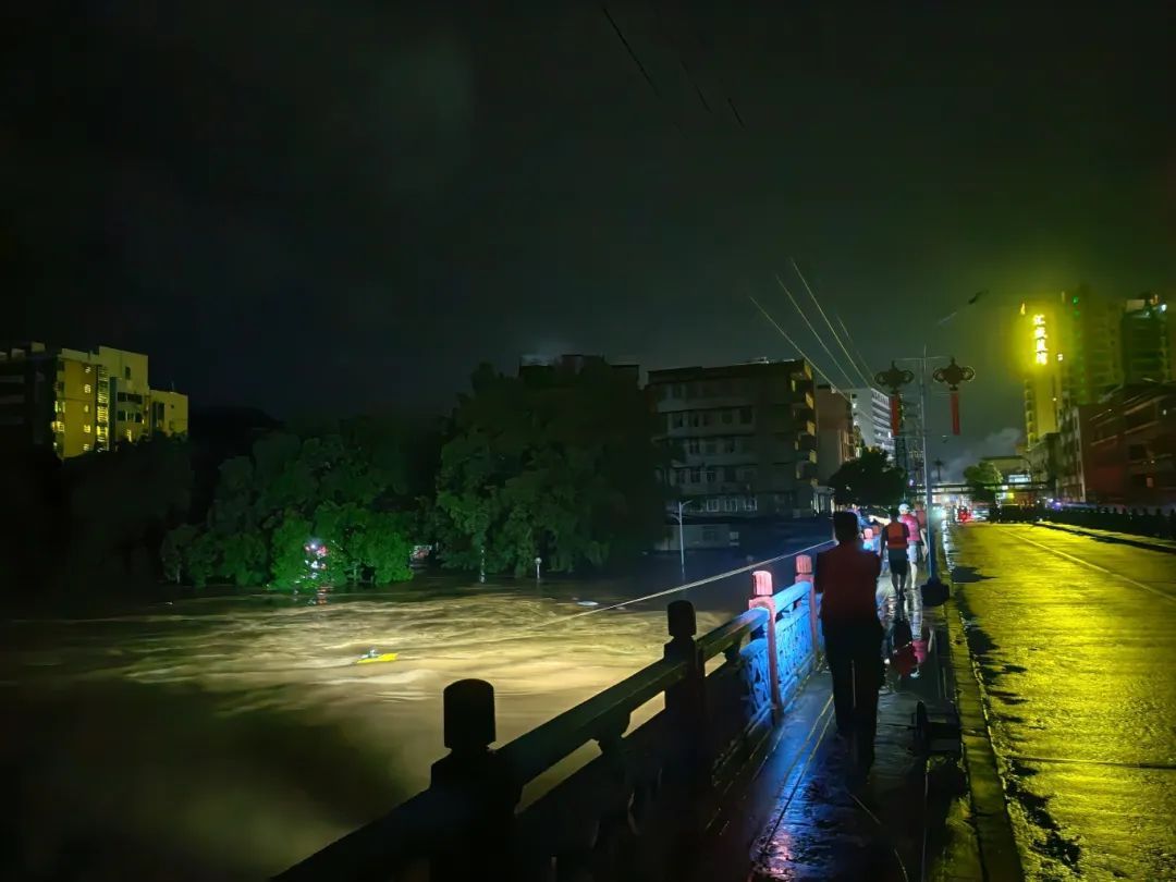 6月18日2时,肇庆市水文分局工作人员在怀城大桥加紧流量测验。广东省水文局肇庆水文分局供图